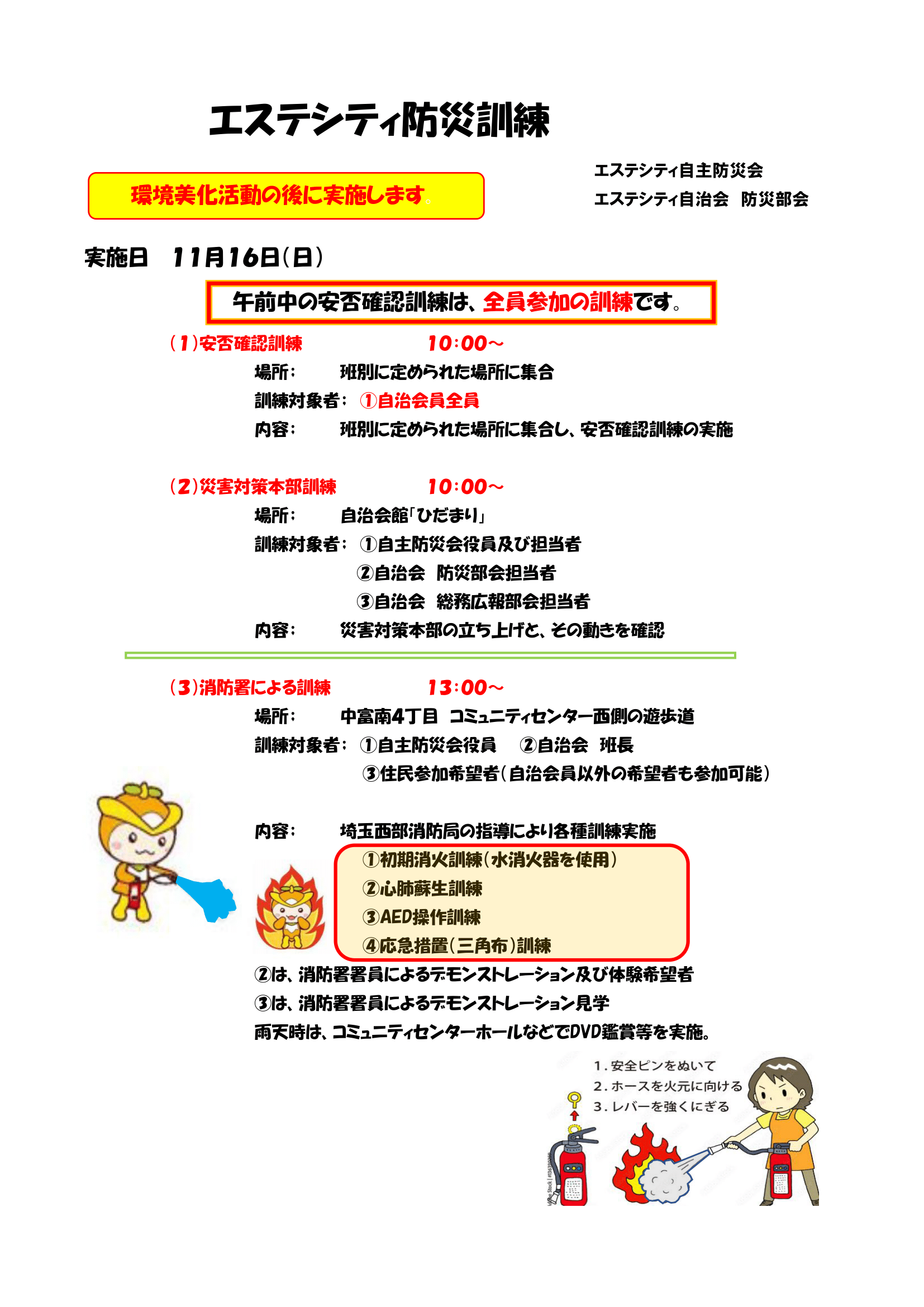 11/16(日) 環境美化活動の後にエステシティ防災訓練を実施いたします。